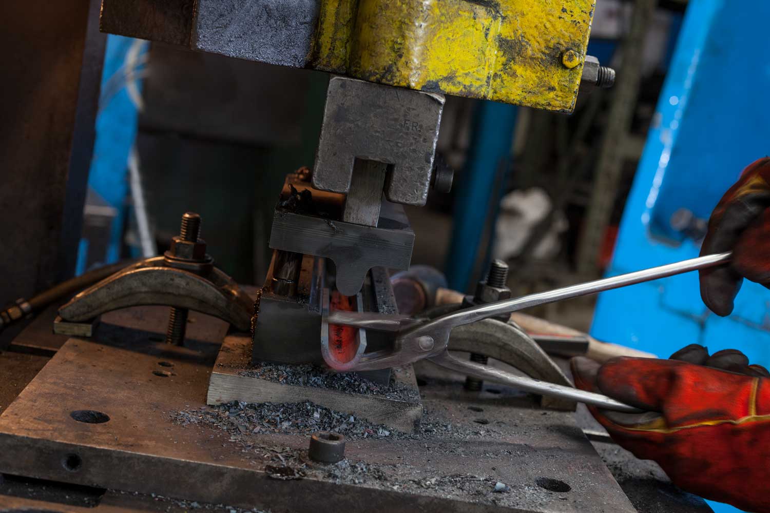 The roughing gouge starts life as a CNC laser cut blank profile which is then heated to around 1000°C and forged into the final profile using bespoke form tooling.